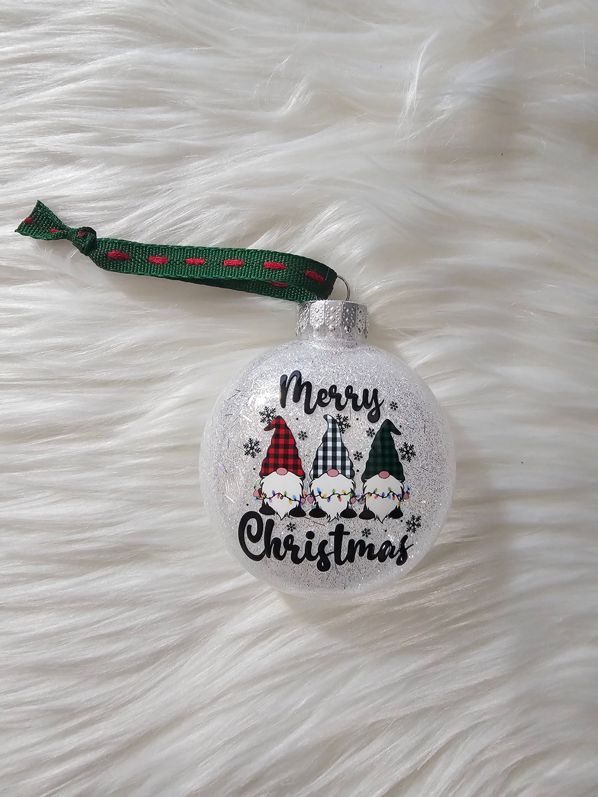 Description: Glittered on the inside with decal on the outside with ribbon for hanging.